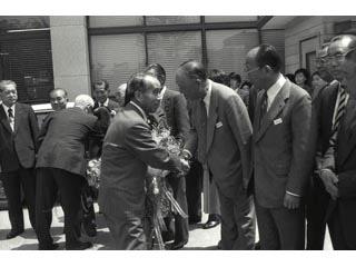この年の秋場所で大活躍した入幕間もない小錦関が兄弟子の富士桜関と和合市長を表敬訪問。この当時でも小錦関の体重は、215kg。椅子に座るのがやっという巨体でした。(9月26日)