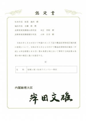 松本市、塩尻市、山形村及び朝日村と共同で申請した特産酒類の製造事業に係る構造改革特別区域計画(ワイン特区)が、令和6年3月22日付で「桔梗ヶ原・松本ワインバレー特区」として内閣総理大臣より認定を受けました。
