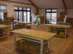 約200人収容可能な研修室と、万能機、ボール盤や電動糸ノコなどを備えた木工体験室があります。